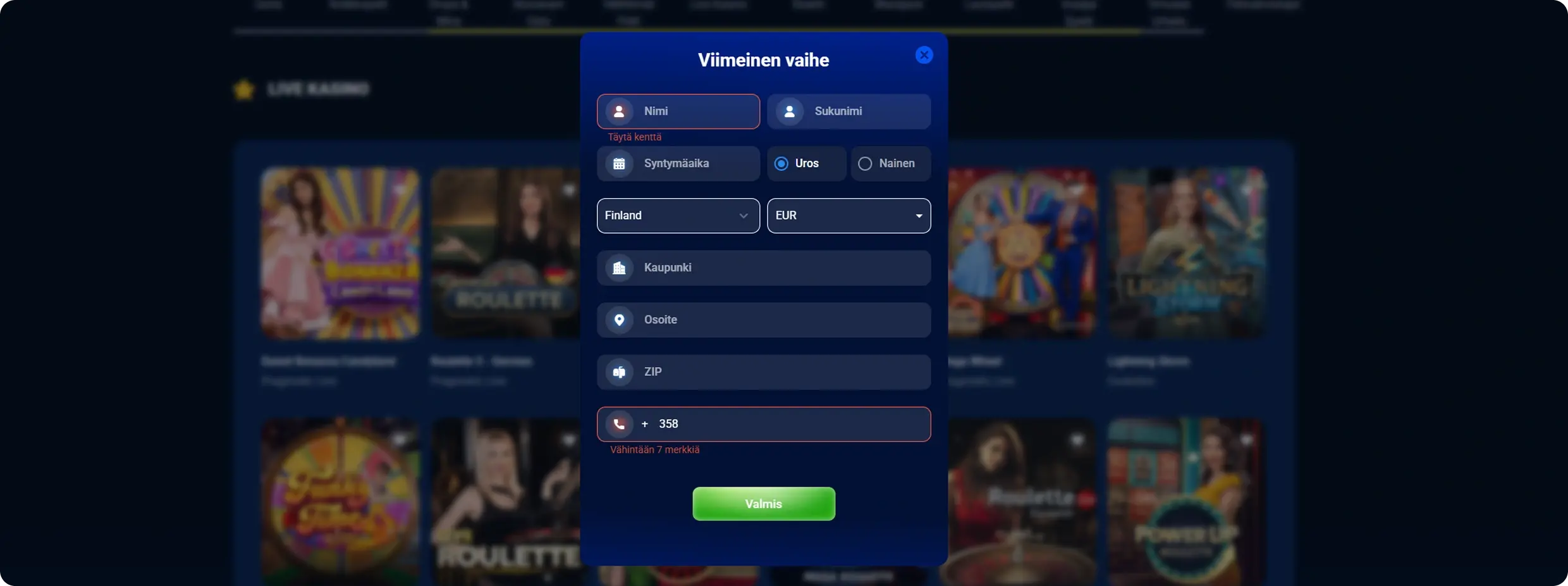 Seuraavaksi täytät perustietosi, kuten nimen, syntymäpäivän, sukupuolen, maan, valuutan ja puhelinnumeron. Jos sinulla on kampanjakoodi, voit käyttää sen tässä vaiheessa.
