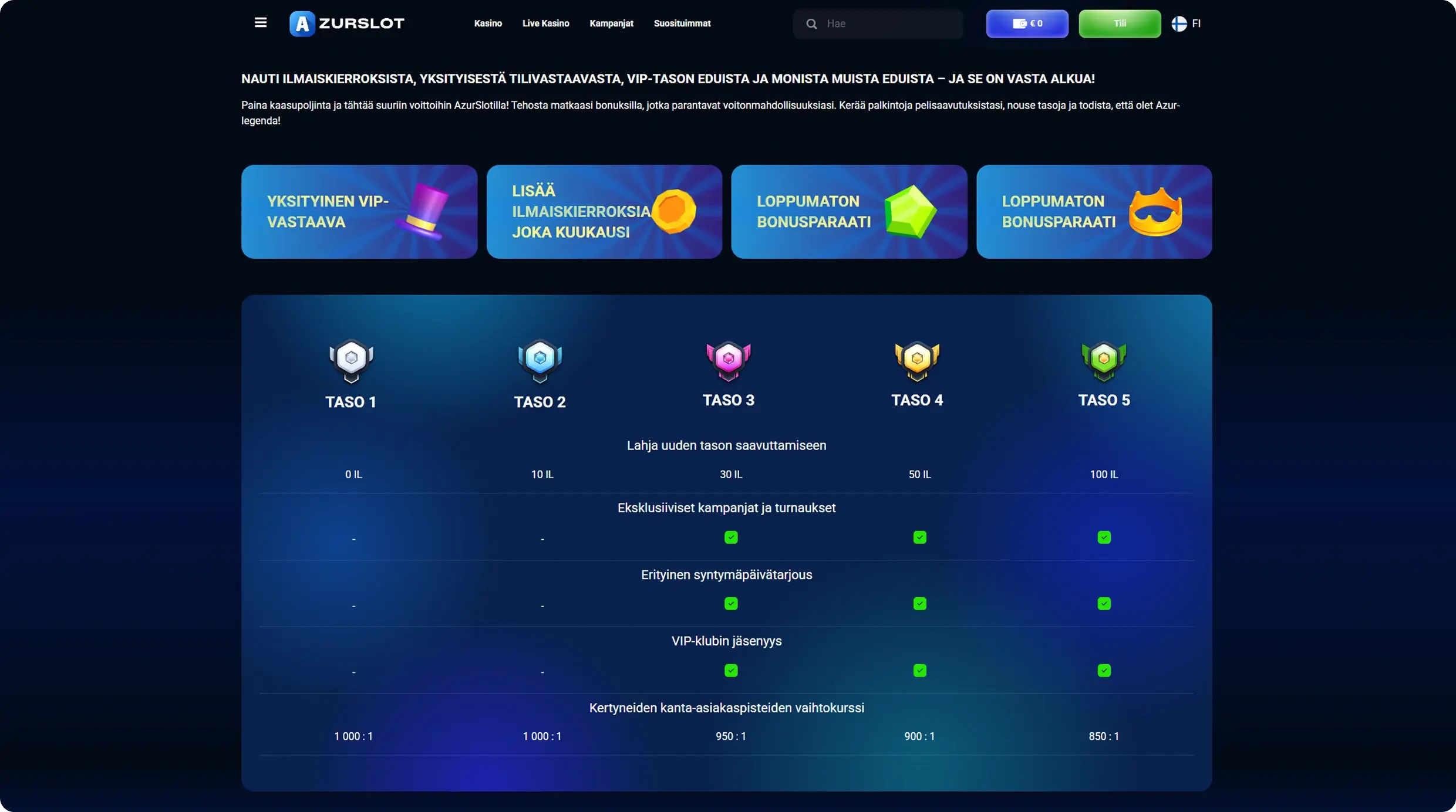 - VIP-taso 1: 1 kolikko jokaista 1 000 € panostusta kohden