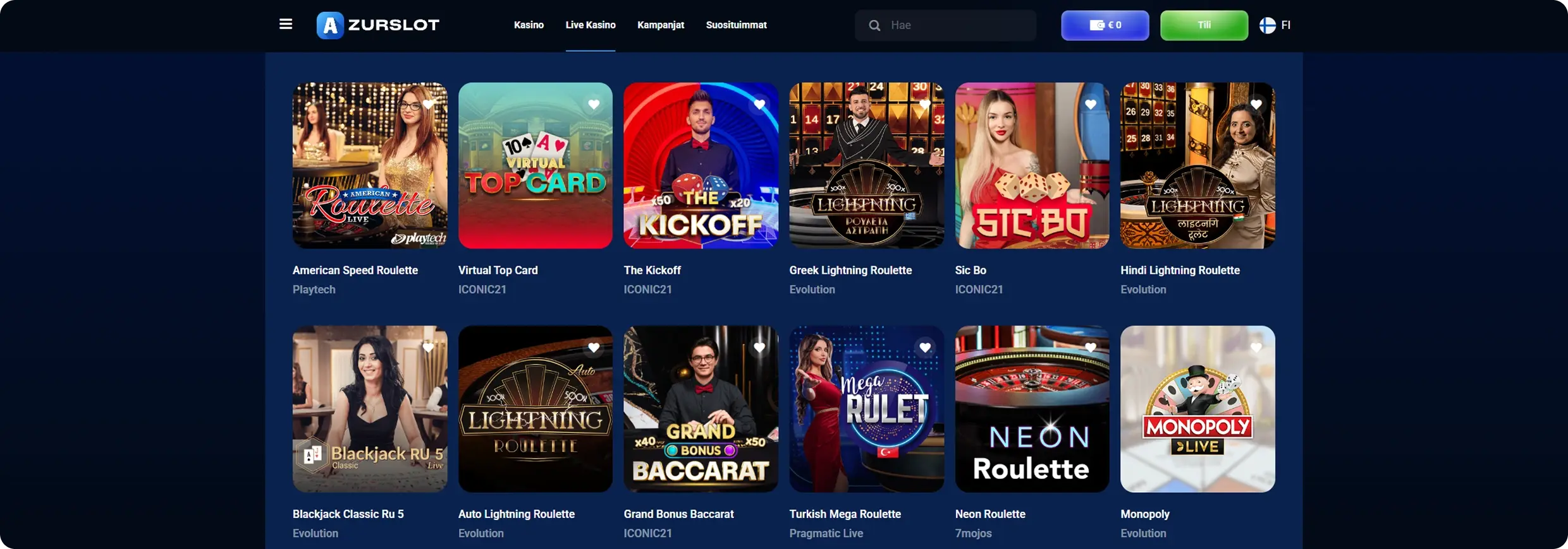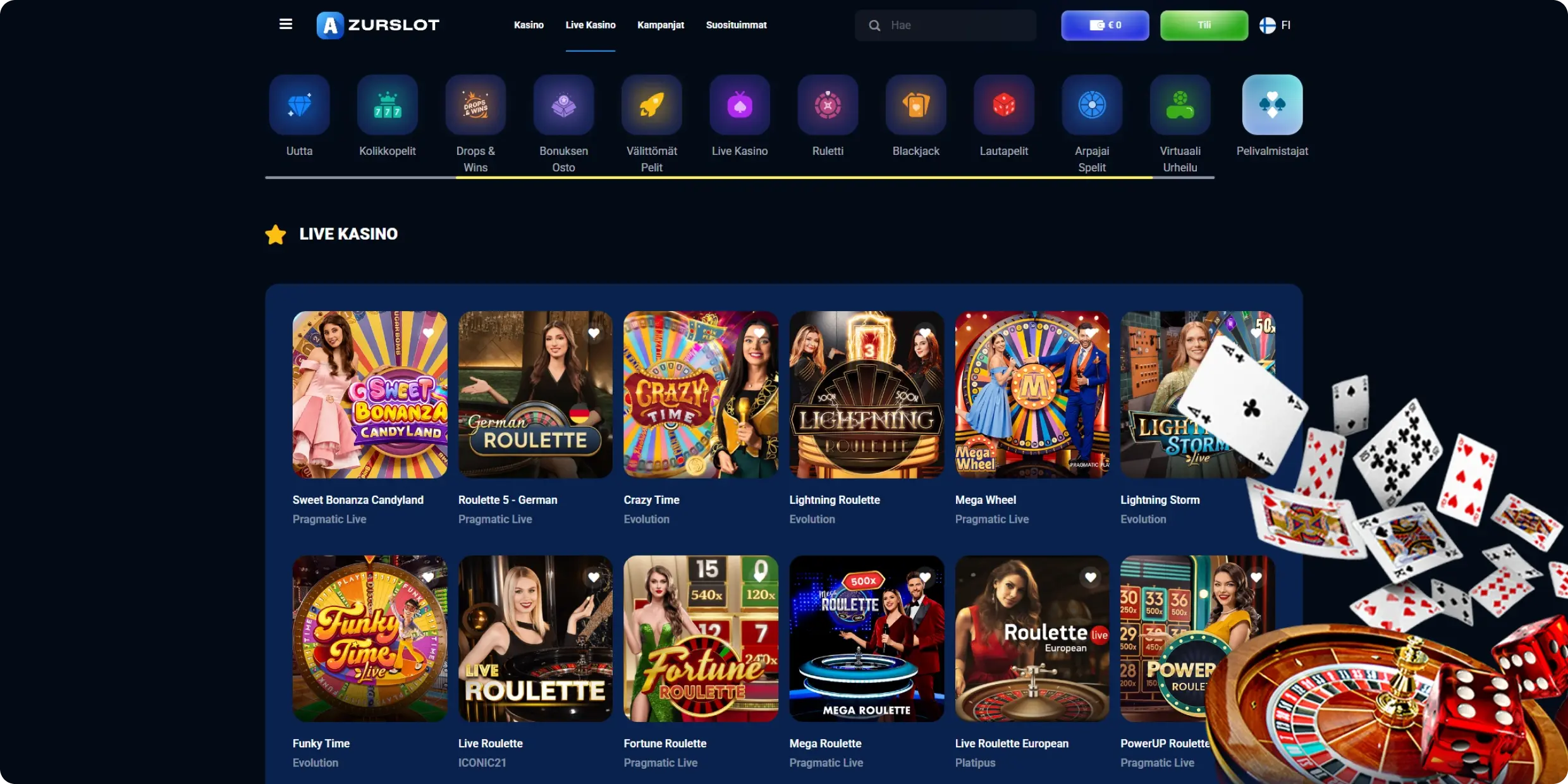 Azur Slot tarjoaa runsaasti live-pelejä klassikoista erikoispeleihin. Valikoimasta löytyvät blackjack, ruletti, baccarat ja pokeri useina versioina.